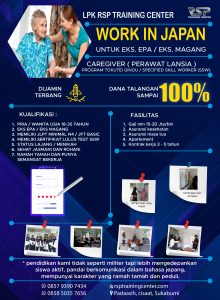 KERJA KE JEPANG UNTUK EKS EPA / EKS MAGANGoleh TrainingCenter14 September 20205 April 2021 untuk Eks EPA / Eks magang yang mau bekerja lagi ke jepang bidang caregiver (perawat lansia), silahkan konsultasikan bersama LPK RSP TRAINING CENTER info/konsultasi :WA :+62 857-9390-7434https://wa.me/message/QZRXNVMOUPBCF1 Tinggalkan Balasan Batalkan balasanAlamat email Anda tidak akan dipublikasikan. Ruas yang wajib ditandai *Komentar * Nama * Email * Situs Web Simpan nama, email, dan situs web saya pada peramban ini untuk komentar saya berikutnya.